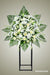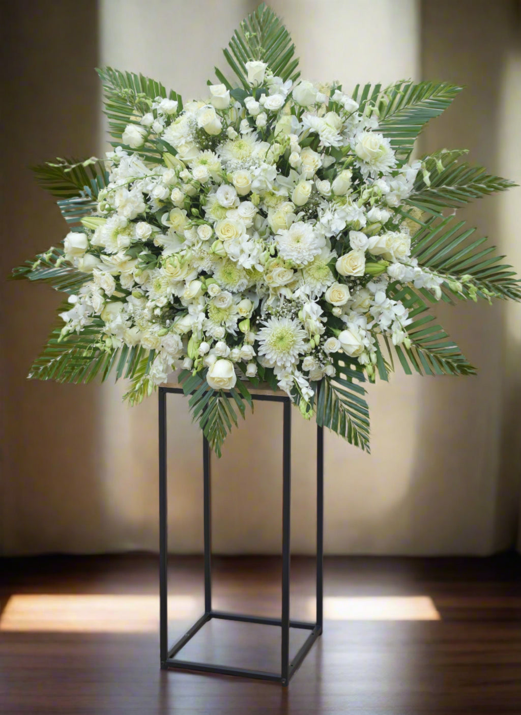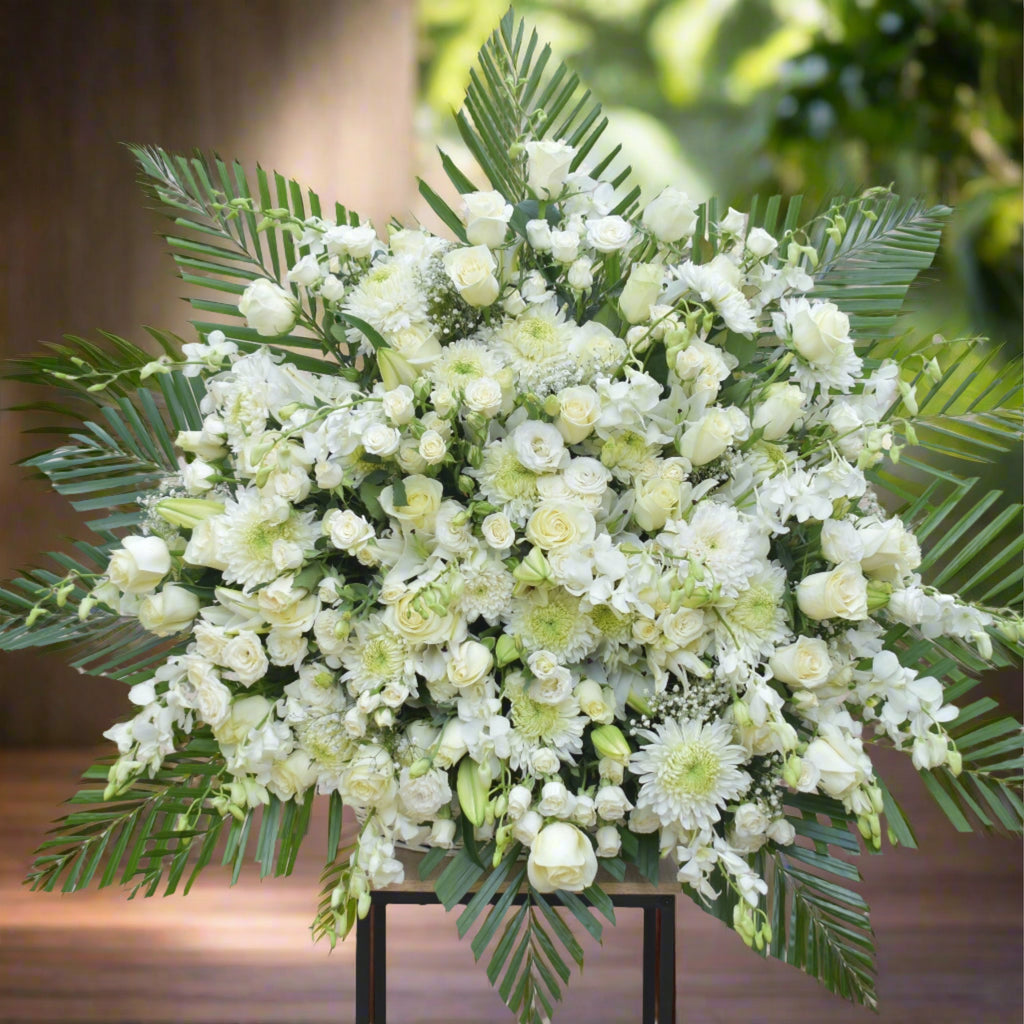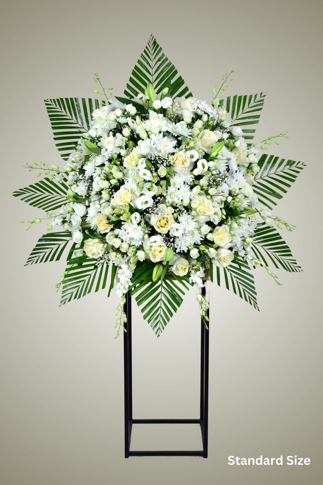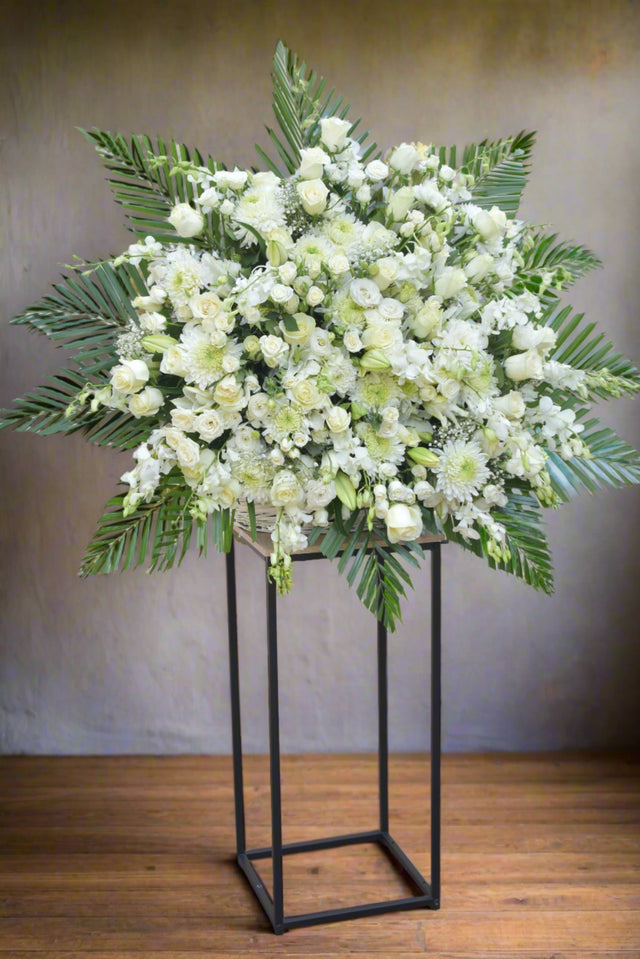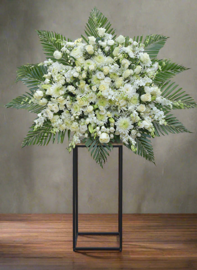 The Serenity Flower Stand is a stunning arrangement of mixed all white seasonal flowers. It features roses, spray roses, lilies, wax flowers, orchids, chrysanthemums, eustoma, greenery, and fillers. This grand design is perfect for occasions such as business openings, sympathy gestures, birthdays, anniversaries, or simply to show someone you care. The flowers are elegantly displayed on top of a metal stand, adding a touch of sophistication to any space.