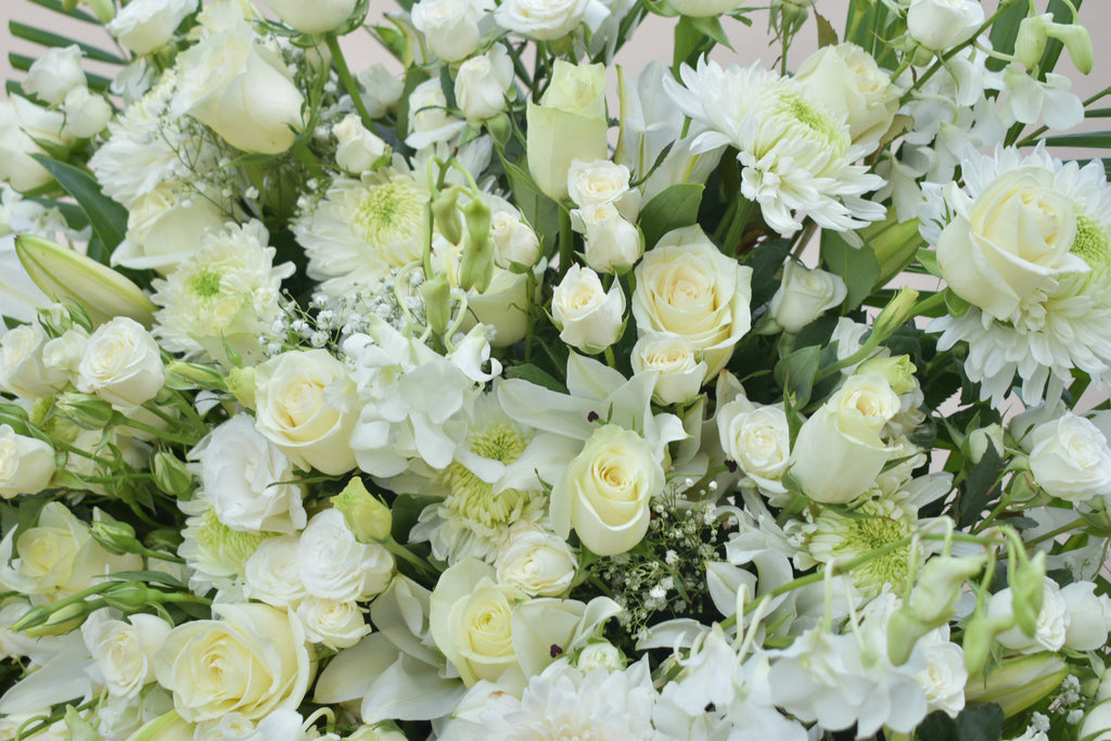 - Mixed all white seasonal flowers for a timeless and elegant look