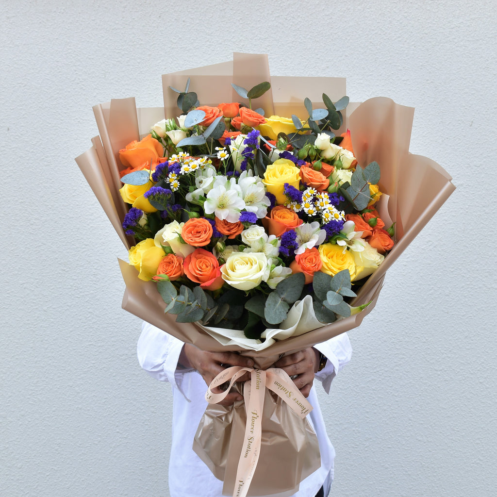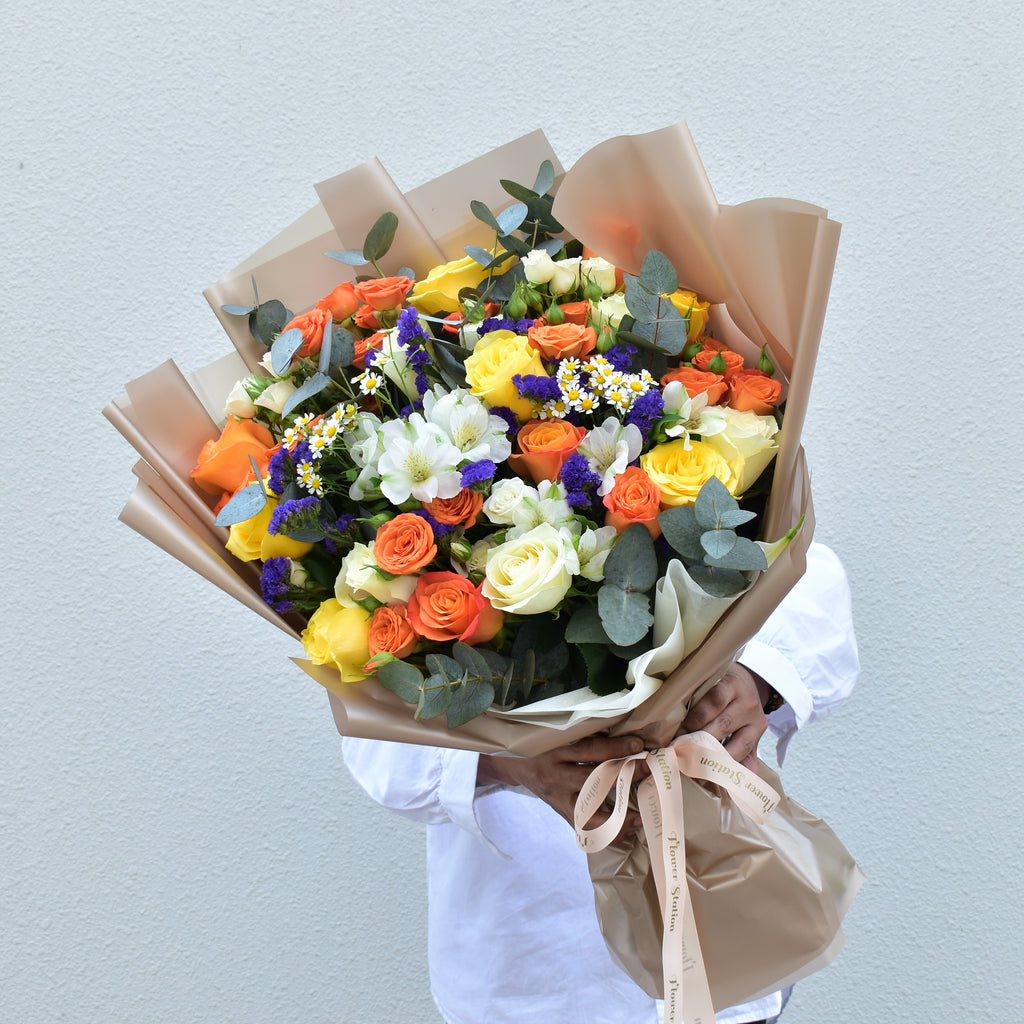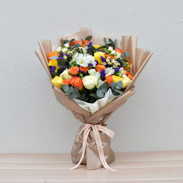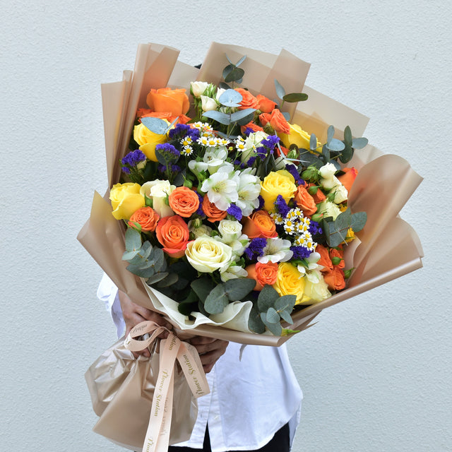 The Delightful bouquet is a stunning arrangement of roses, spray roses, alstroemeria, chamomile, and eucalyptus. The combination of these beautiful flowers creates a harmonious blend of colors and textures. Wrapped in a brown/gold wrapper and finished with a peach ribbon, this bouquet is the perfect gift for any occasion.
