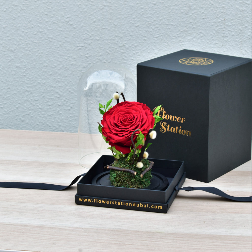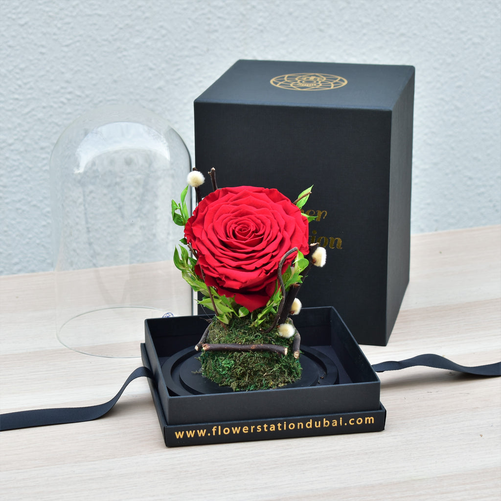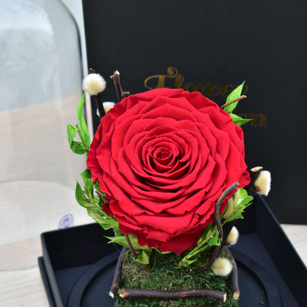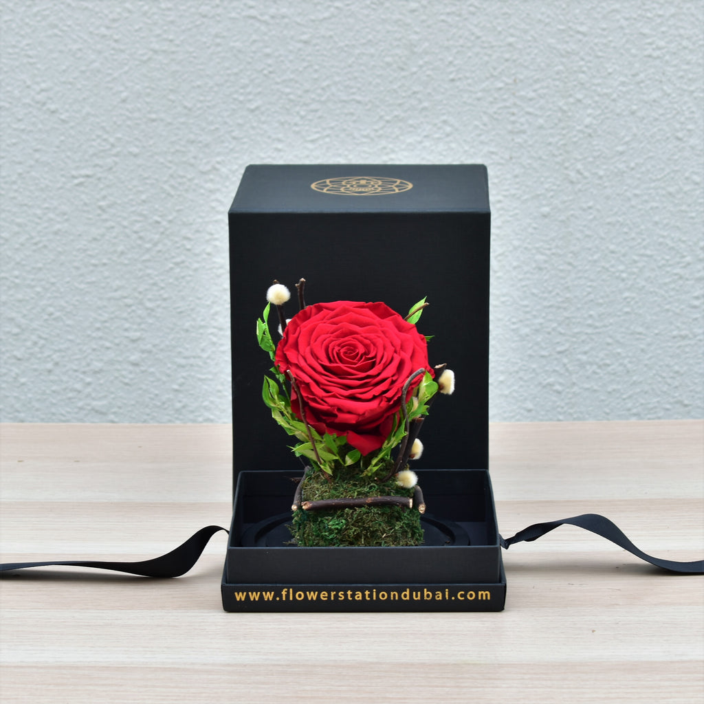 I Love You - Forever Flowers offers a unique and long-lasting gift that will last forever. It is complemented by the delicate Willow, Italian Ruscus, Salix Stick, and Moss, creating a sophisticated and romantic display. Presented in a black box tied with a ribbon, this Forever Flower is a stunning and timeless gift that will be cherished forever.