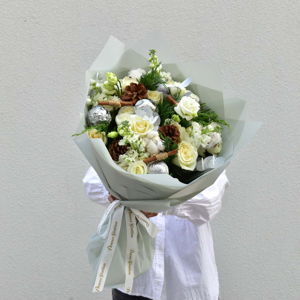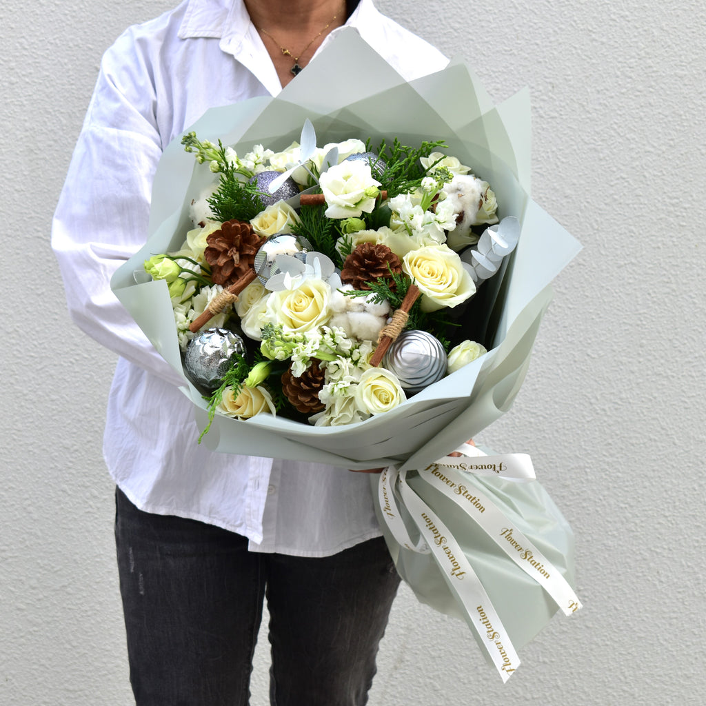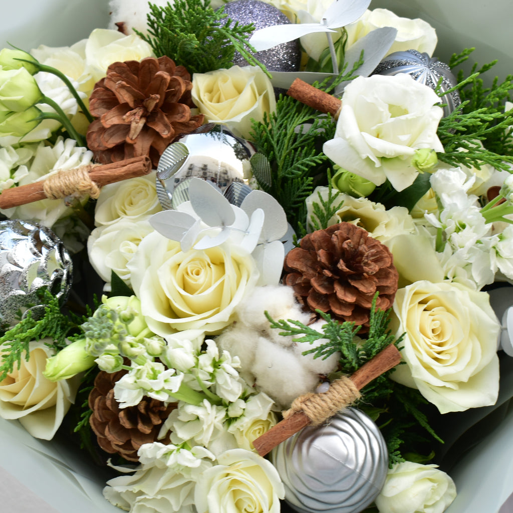 Celebrate the season with the elegant charm of our Christmas Rhymes bouquet. A delicate mix of white eustoma, white roses, spray roses, and matthiola exudes purity and sophistication, beautifully accented with pinecones, cotton, festive balls, and cinnamon sticks for a warm, holiday touch. Lush white eucalyptus and conifer leaves bring freshness and texture, all wrapped in stylish paper and tied with a white ribbon, creating a serene and festive centerpiece perfect for gifting or decorating your home.