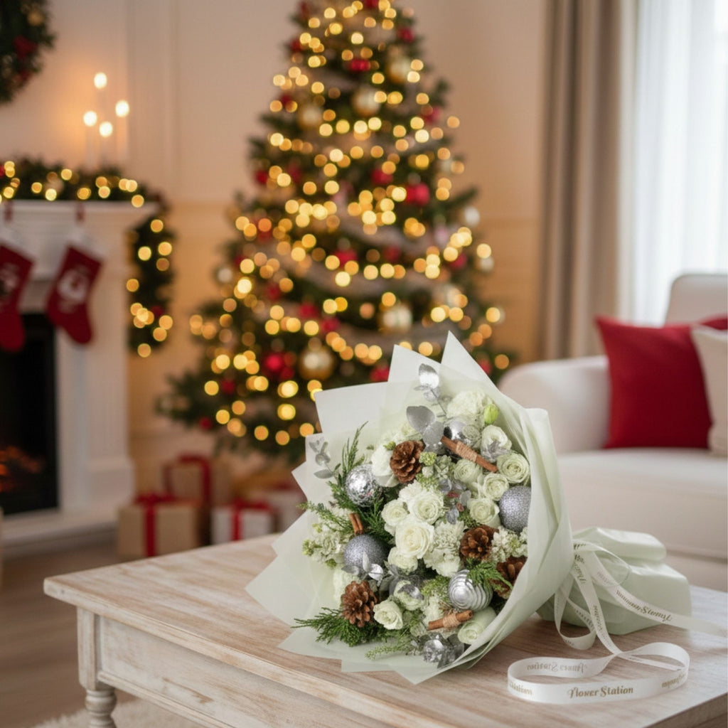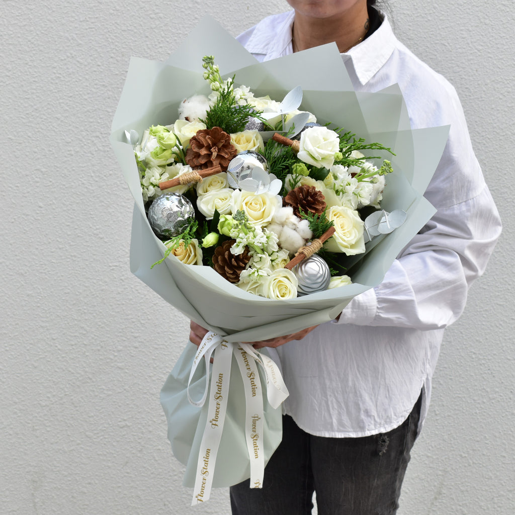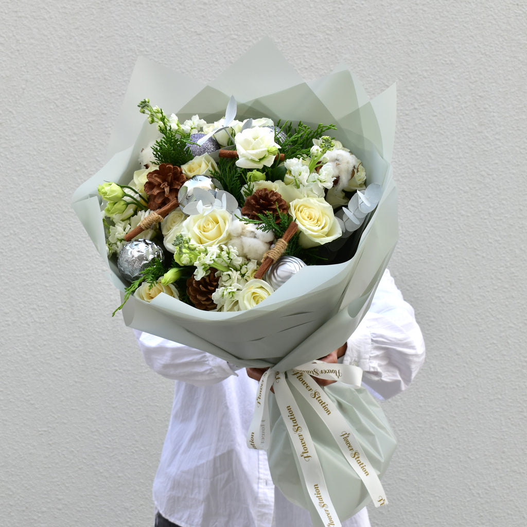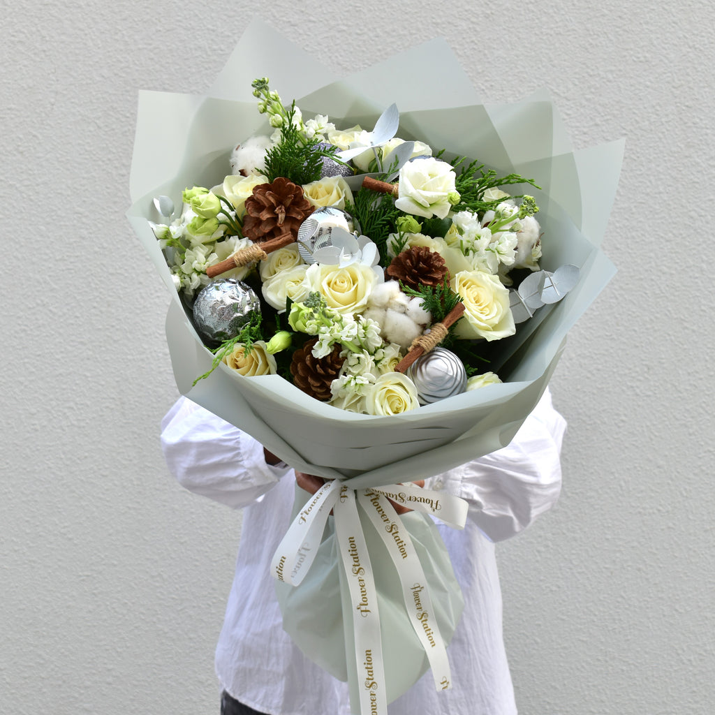 Celebrate the season with the elegant charm of our Christmas Rhymes bouquet. A delicate mix of white eustoma, white roses, spray roses, and matthiola exudes purity and sophistication, beautifully accented with pinecones, cotton, festive balls, and cinnamon sticks for a warm, holiday touch. Lush white eucalyptus and conifer leaves bring freshness and texture, all wrapped in stylish paper and tied with a white ribbon, creating a serene and festive centerpiece perfect for gifting or decorating your home.