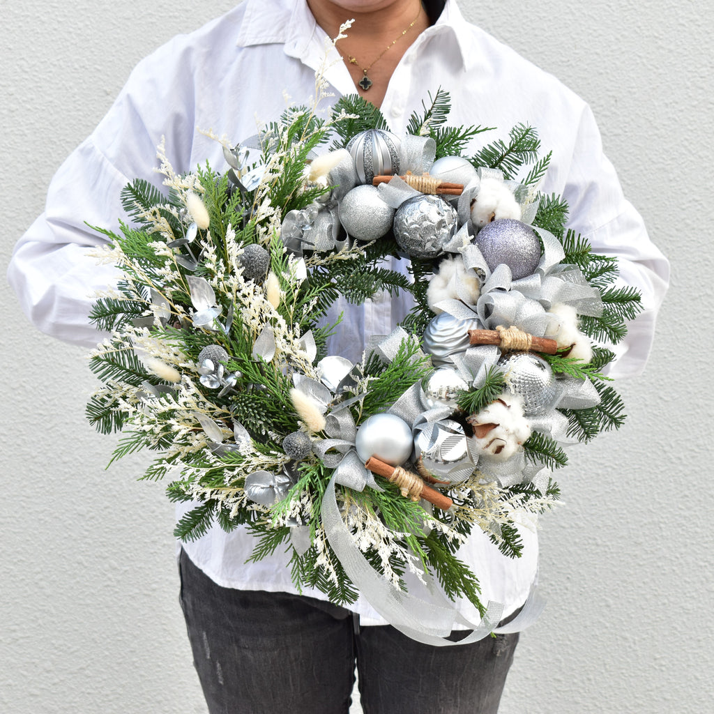 Celebrate a serene and elegant holiday season with the White Noel - Christmas Wreath. Adorned with seasonal accents like decorative balls, limonium, cotton, cinnamon sticks, craspedia, and bunny tails, and enriched with lush eucalyptus, nobilus, and conifer greenery, this wreath evokes festive charm with a sophisticated touch. Tied with a silver ribbon, it’s a perfect centerpiece for doors, walls, or holiday décor.