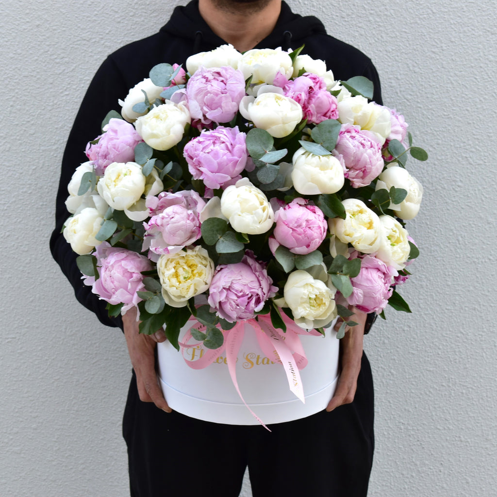 premium pink and white peonies in a white round hatbox with touch of eucalyptus - peony delivery dubai