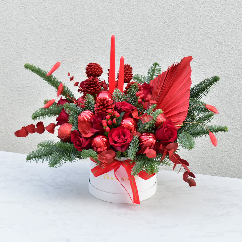 Spread holiday cheer with the Festive Joy flower box, a charming blend of roses and hypericum accented with seasonal touches of pinecones, decorative balls, palm leaves, and bunny tails. Lush eucalyptus and nobilus greenery bring texture and freshness, while the elegant white box finished with a white ribbon makes it a perfect gift-ready arrangement for any festive occasion.