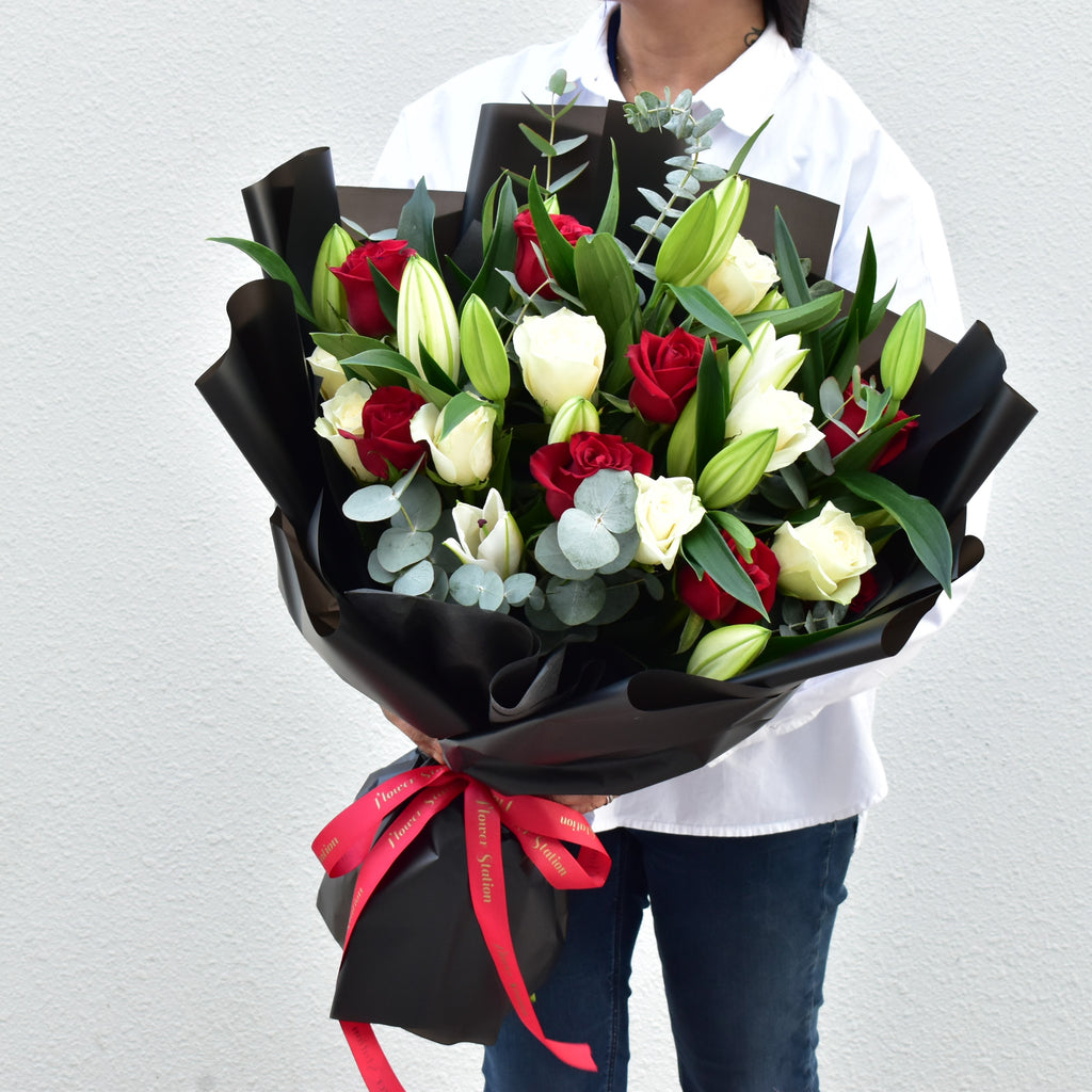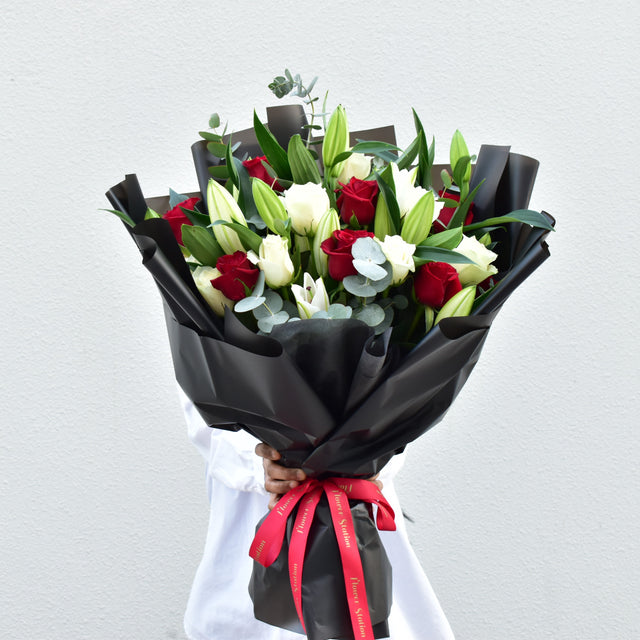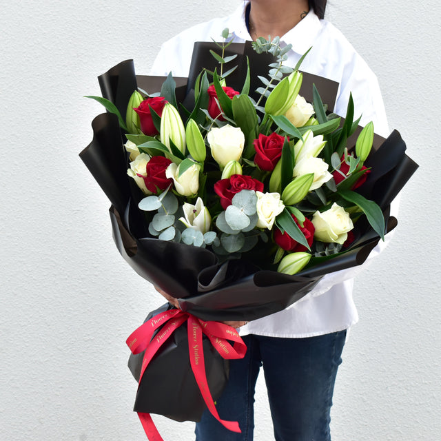 The Happily Together - Mixed Bouquet is a stunning arrangement of lily, rose and eucalyptus. It is carefully wrapped with a beautiful black wrapper and finished with a delicate red ribbon. This bouquet is the perfect gift to express love, affection, and admiration to someone special.