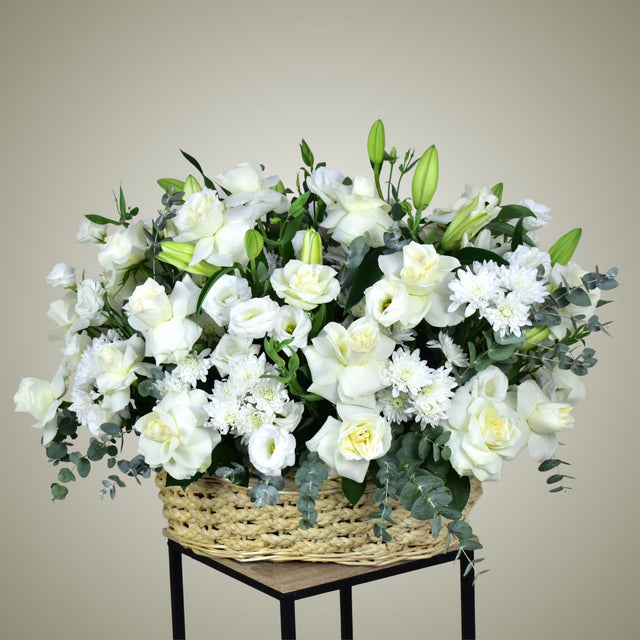 Express purity and elegance with our "Pure Sentiments" flower basket. This luxurious arrangement features a harmonious blend of white roses, lilies, lisianthus, and chrysanthemums, accented with fresh eucalyptus foliage and arranged in a rustic woven basket. Symbolizing grace and tranquility, this bouquet is ideal for weddings, sympathy gestures, or simply to convey a serene and heartfelt message.