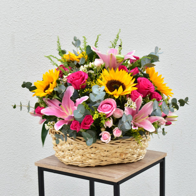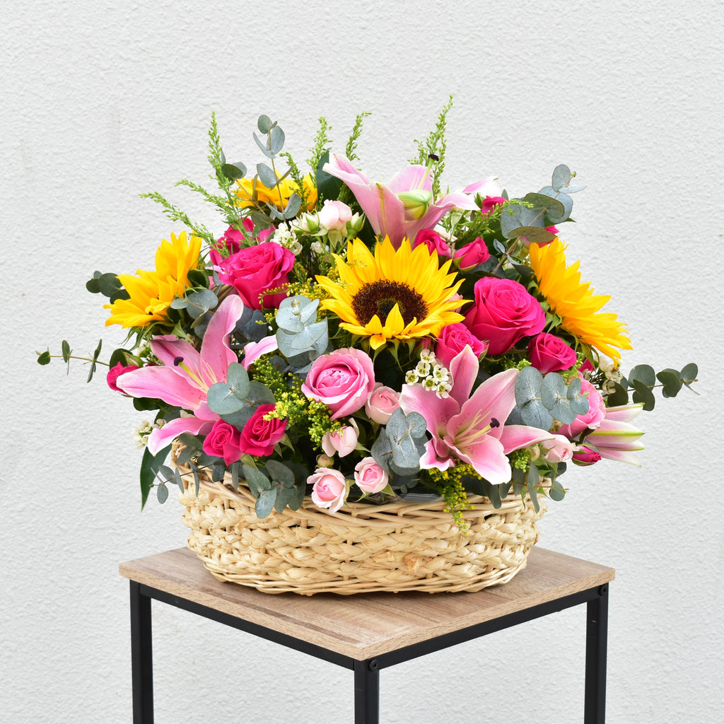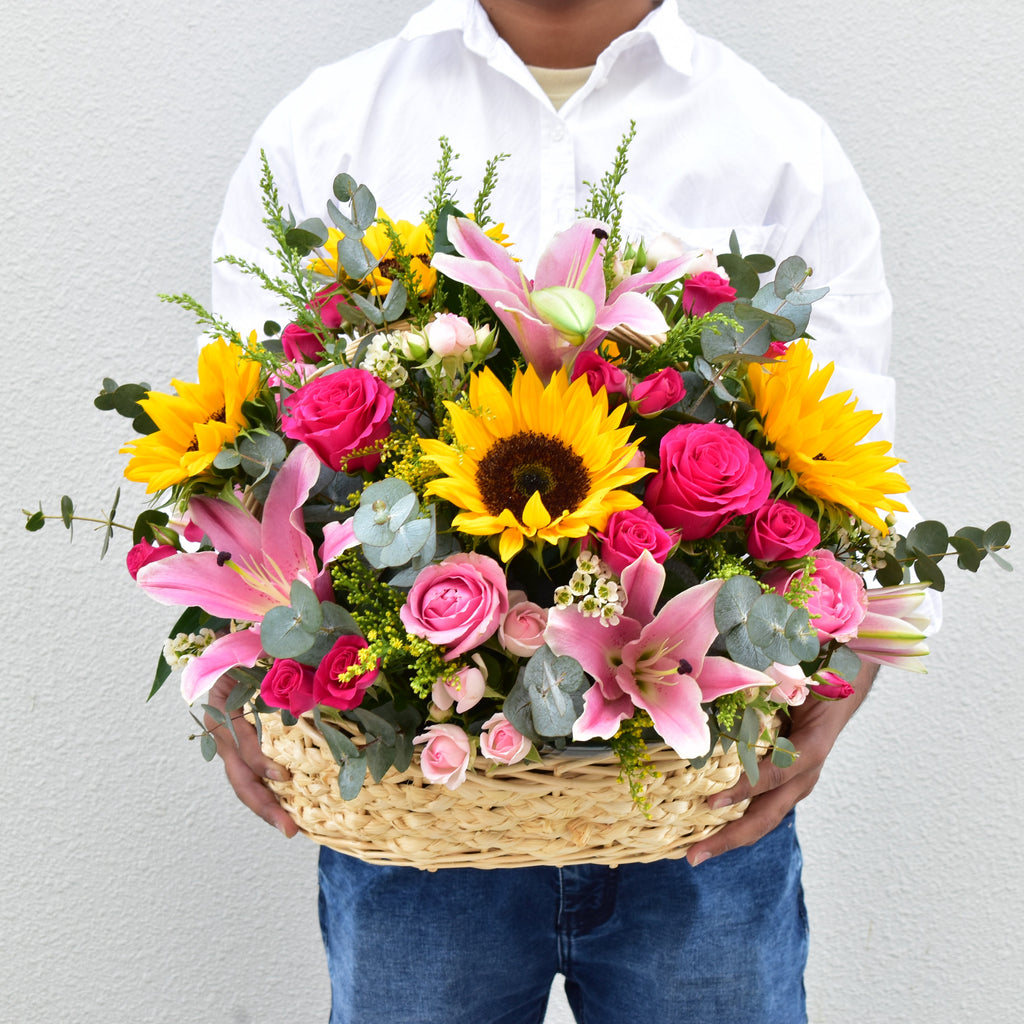 Delight someone special—or yourself—with the charming elegance of Pink Meadow Delight. This handcrafted floral basket bursts with joyful sunflowers, graceful pink lilies, vibrant fuchsia and pink roses, delicate spray roses, soft wax flowers, solidago, and lush eucalyptus, all arranged in a natural wicker basket.