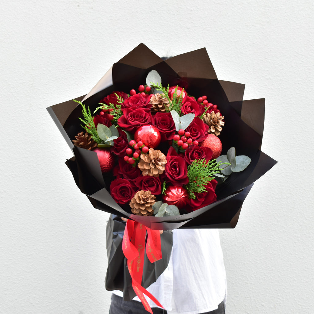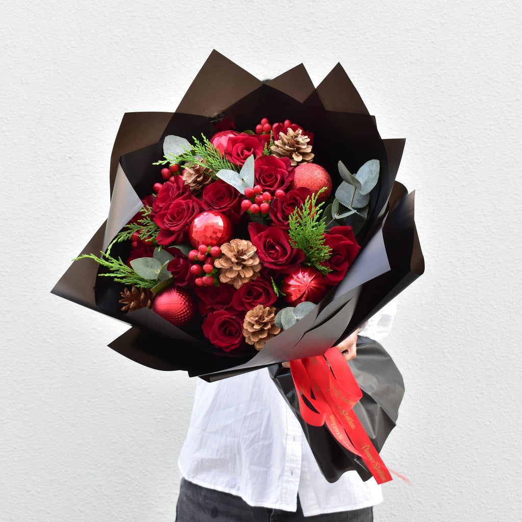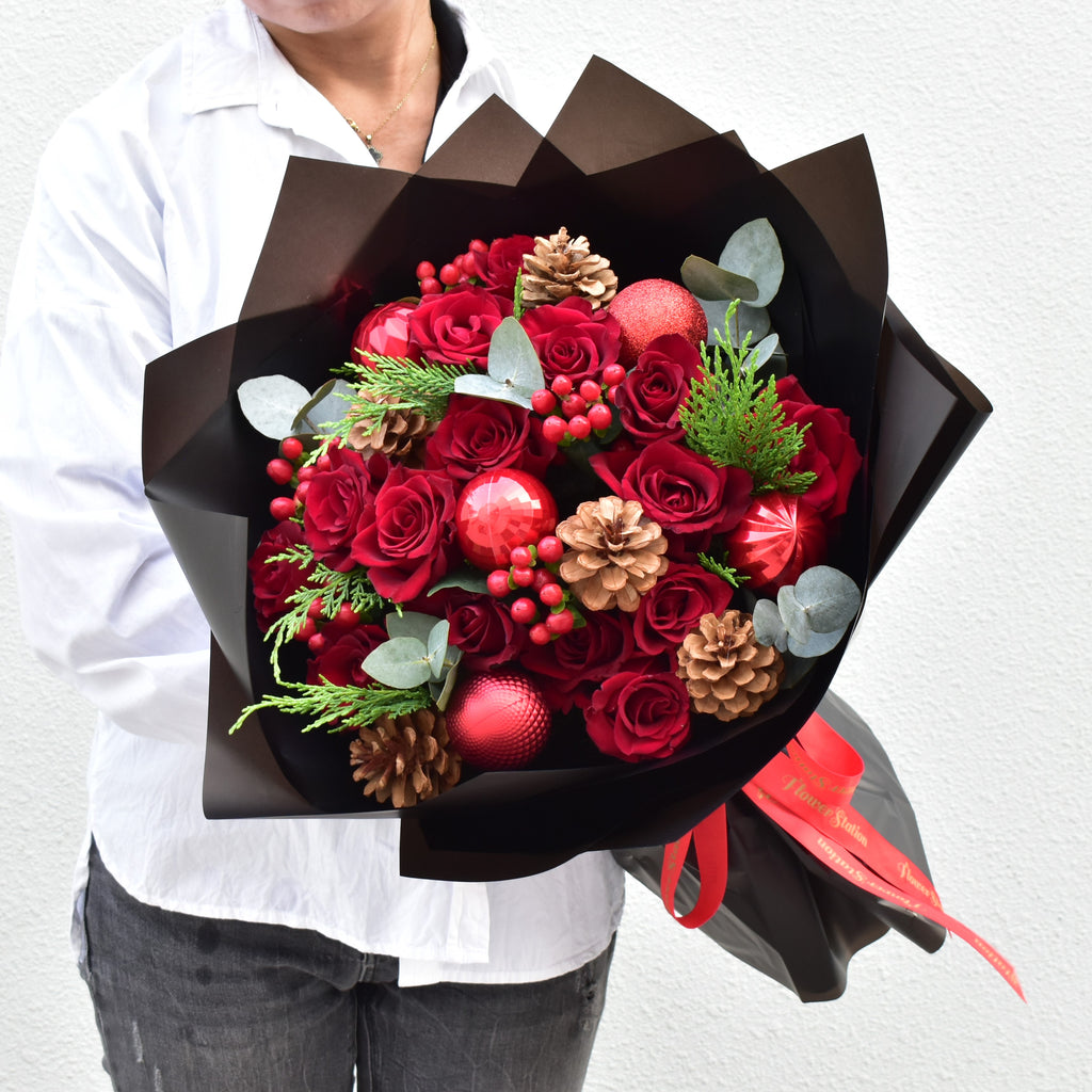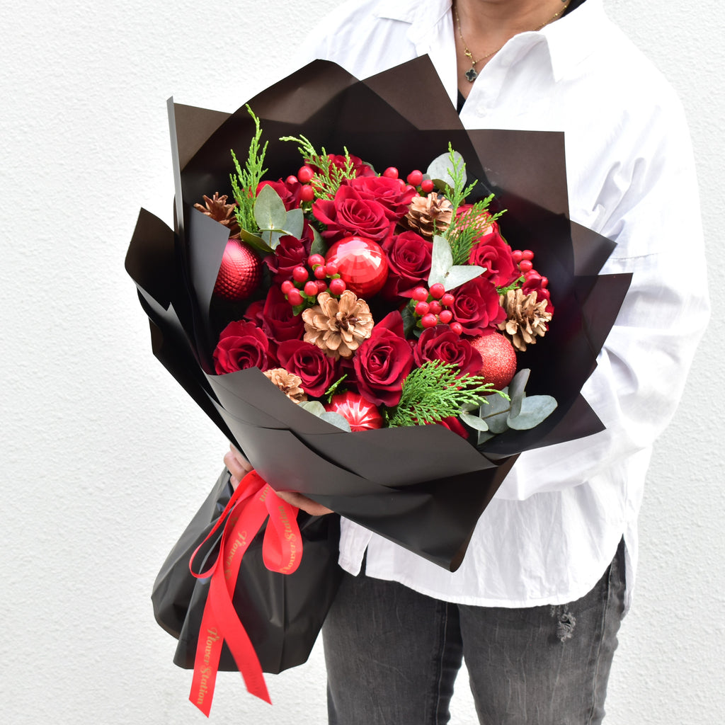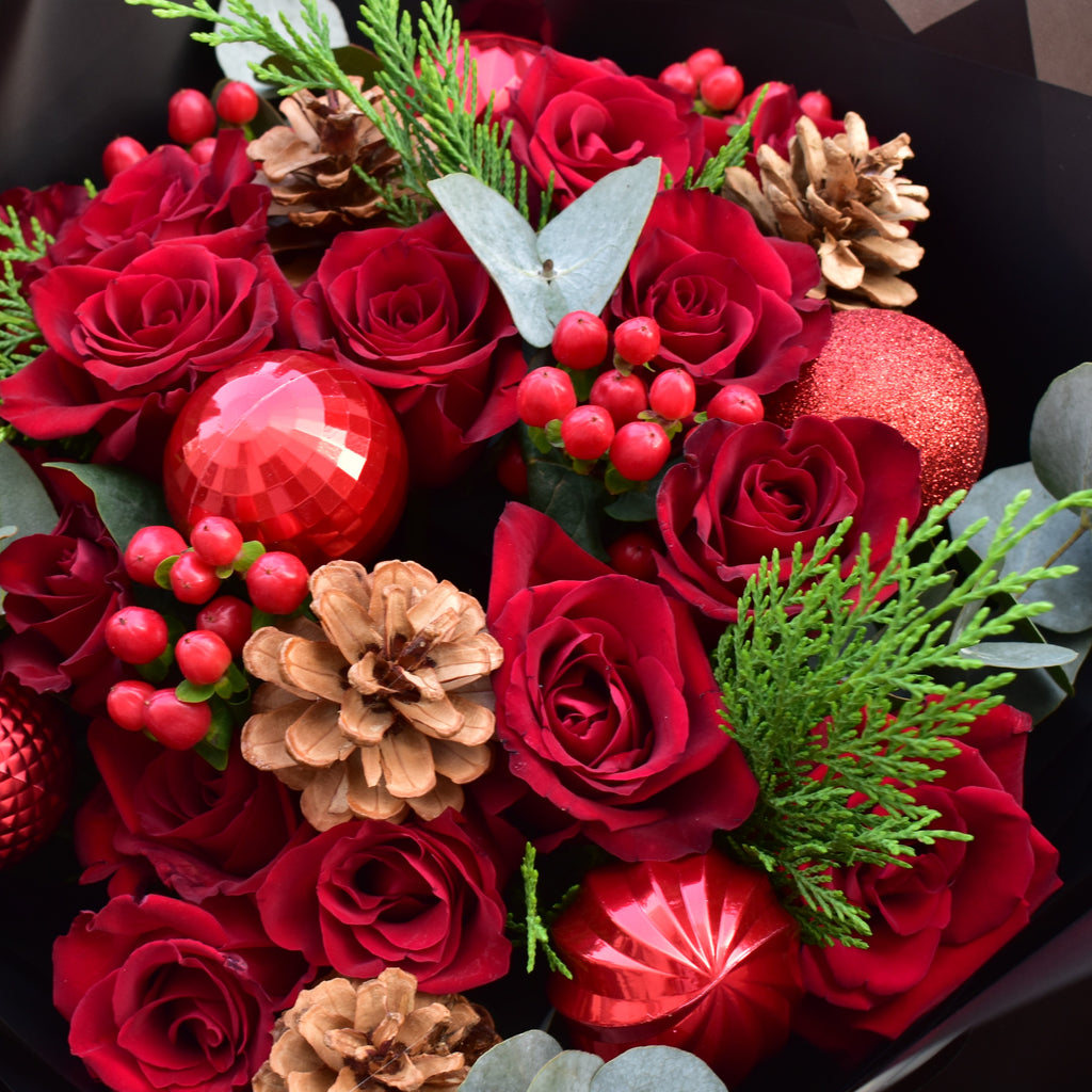Celebrate the festive season with the enchanting charm of our Christmas Magic bouquet. A rich blend of red roses and red hypericum bursts with holiday cheer, complemented by playful red balls and natural pinecones, evoking the warmth and magic of Christmas. Lush eucalyptus and conifer leaves add a refreshing green touch, while the elegant black wrapping with a red ribbon gives a sophisticated, festive finish, perfect for gifting or decorating your home.