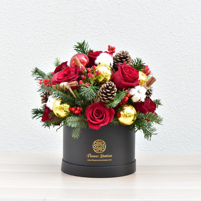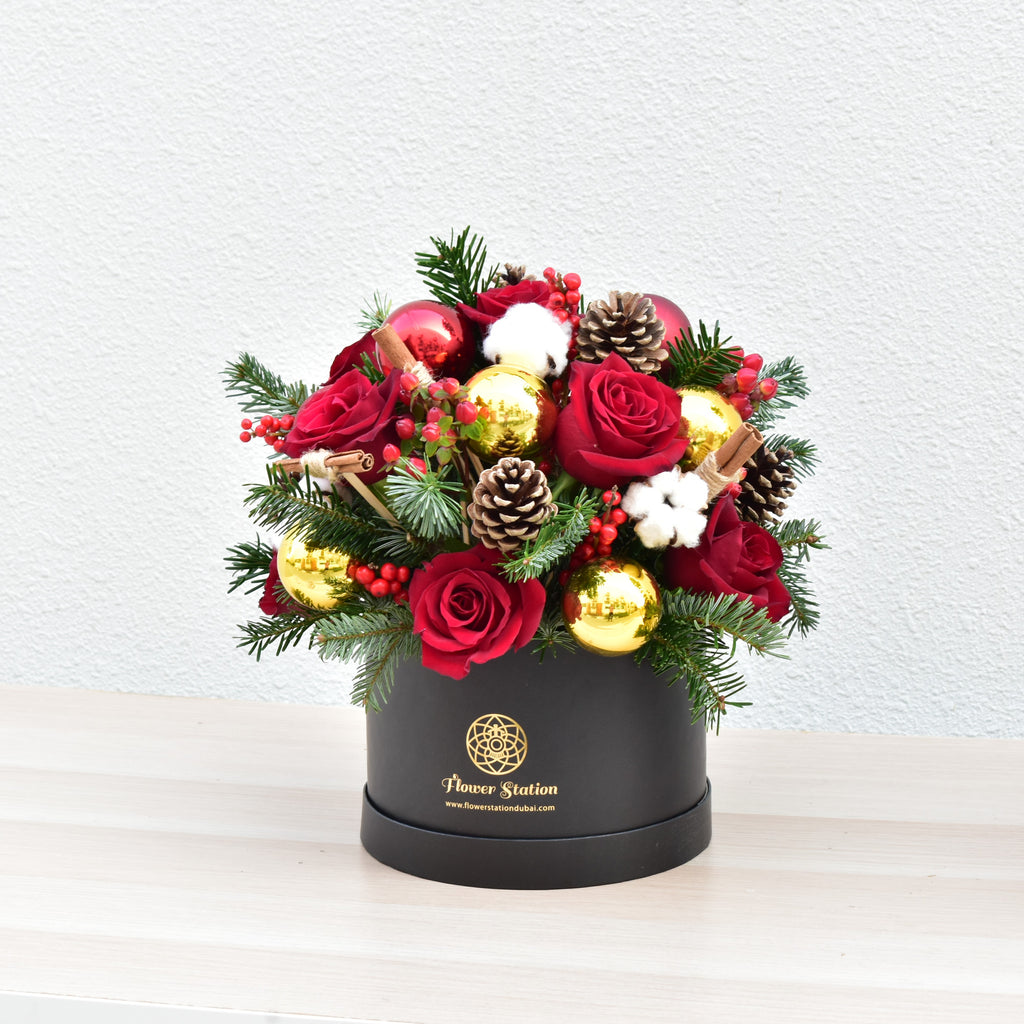Gift a heartfelt holiday surprise with our exquisite Silent Night Flower Box. This stunning floral arrangement boasts a vibrant blend of Red Roses, Pine Cones, Cinnamon, Cotton, Christmas Balls, Hypericum Berries, and Christmas Greenery, all meticulously assembled in a sleek black box. It serves as an ideal present to uplift someone's spirits or to infuse any area with a splash of festive color.