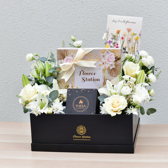 The Creative Blooms Gift Hamper is the perfect gift for any occasion. It features a beautiful arrangement of mixed white flowers, symbolizing purity and elegance. Along with the flowers, the hamper includes a selection of mixed nuts and indulgent Belgian chocolates, providing a delightful treat for the recipient. To create a relaxing ambiance, scented candles are included, adding a touch of tranquility to any space. Lastly, a greeting card designed in a square black box allows you to personalize your message and convey your warm wishes. This gift hamper is a thoughtful and luxurious choice for birthdays, anniversaries, or any special event.