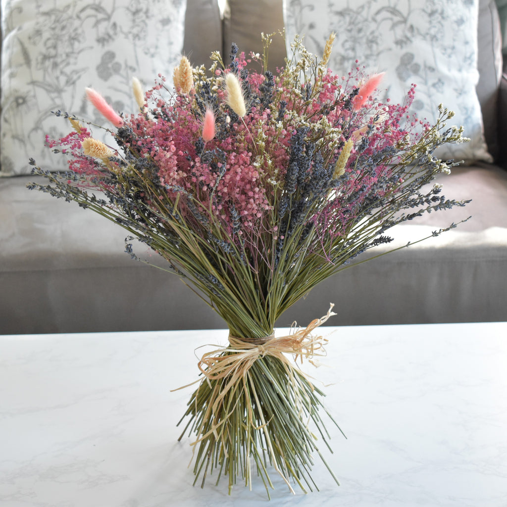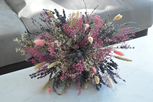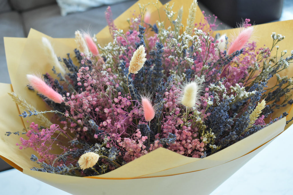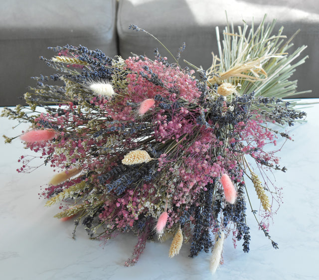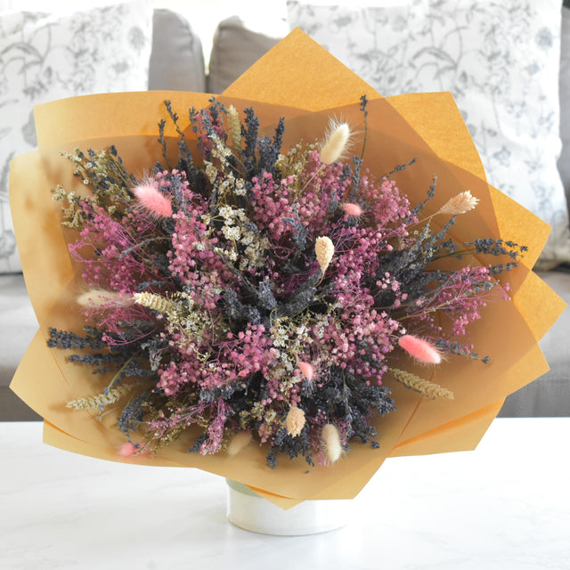 Bring the beauty of a secret garden into your home with this stunning dried and preserved flower arrangement. Each flower is carefully selected and arranged to create a harmonious and enchanting display. The combination of Limonium, Pink Gypsophila, Lagurus (Bunny Tail), Wheat, Lavender, and Phalaris creates a soothing and aromatic atmosphere. The arrangement is elegantly wrapped with a brown wrapper, adding a rustic touch to any space.