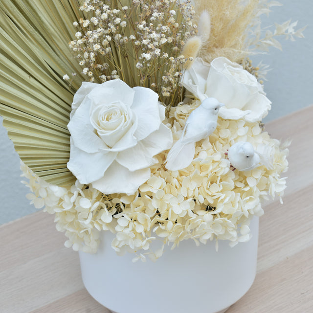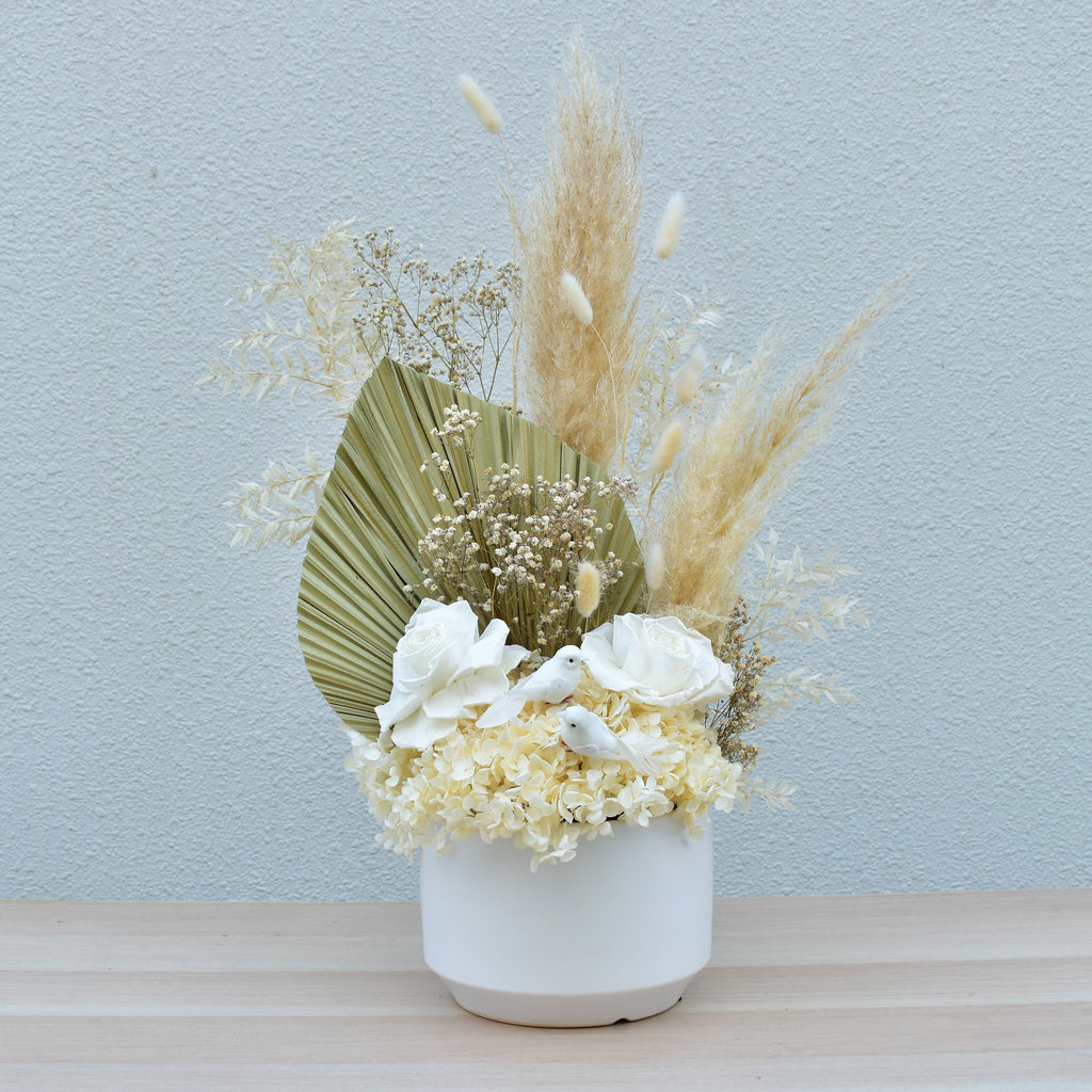 Bring a touch of serenity and natural beauty into your home with the Serene Dried and Preserved Flower Arrangement. This stunning arrangement features a combination of Rustic colored Pampas, Hydrangea, Sola Rose, Craspedia, Limonium, Palm Leaf, Italian Ruscus, and Lagurus (Bunny Tail). The arrangement is carefully designed in an elegant ceramic vase, for a charming touch. These dried and preserved flowers will add a touch of elegance and tranquility to any space, and they require no maintenance or watering. Enjoy the beauty of flowers all year round with the Serene Dried Flower Arrangement.Ā
