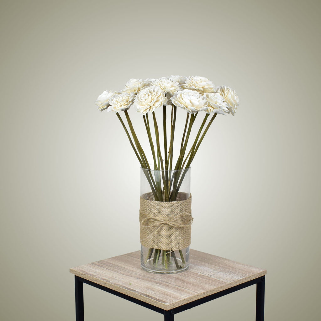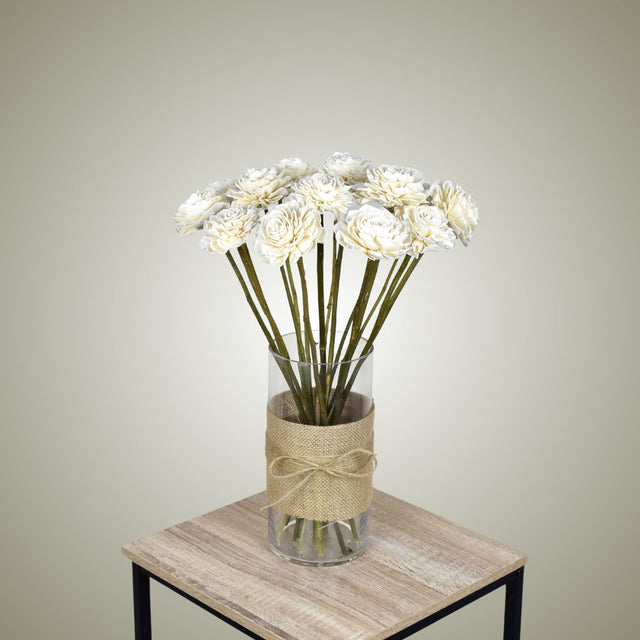 Add an elegant, handcrafted touch to your space with our Sola Roses in Glass Vase. These stunning faux roses are made from the dried bark of the Sola plant, giving them a natural, lightweight texture with delicate ivory petals that resemble real roses. Arranged in a clear glass vase, the roses are complemented by a burlap wrap and twine tie, adding a rustic charm to the arrangement.
