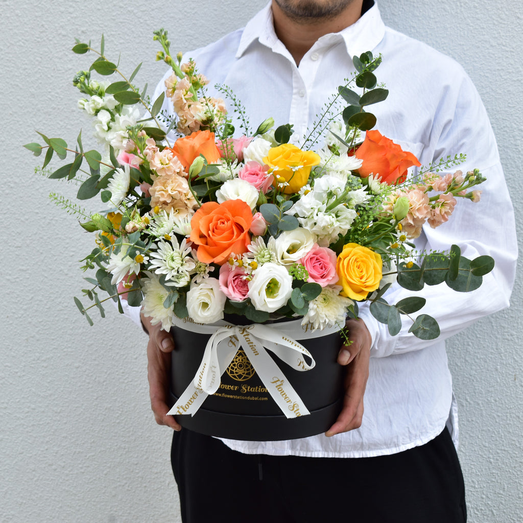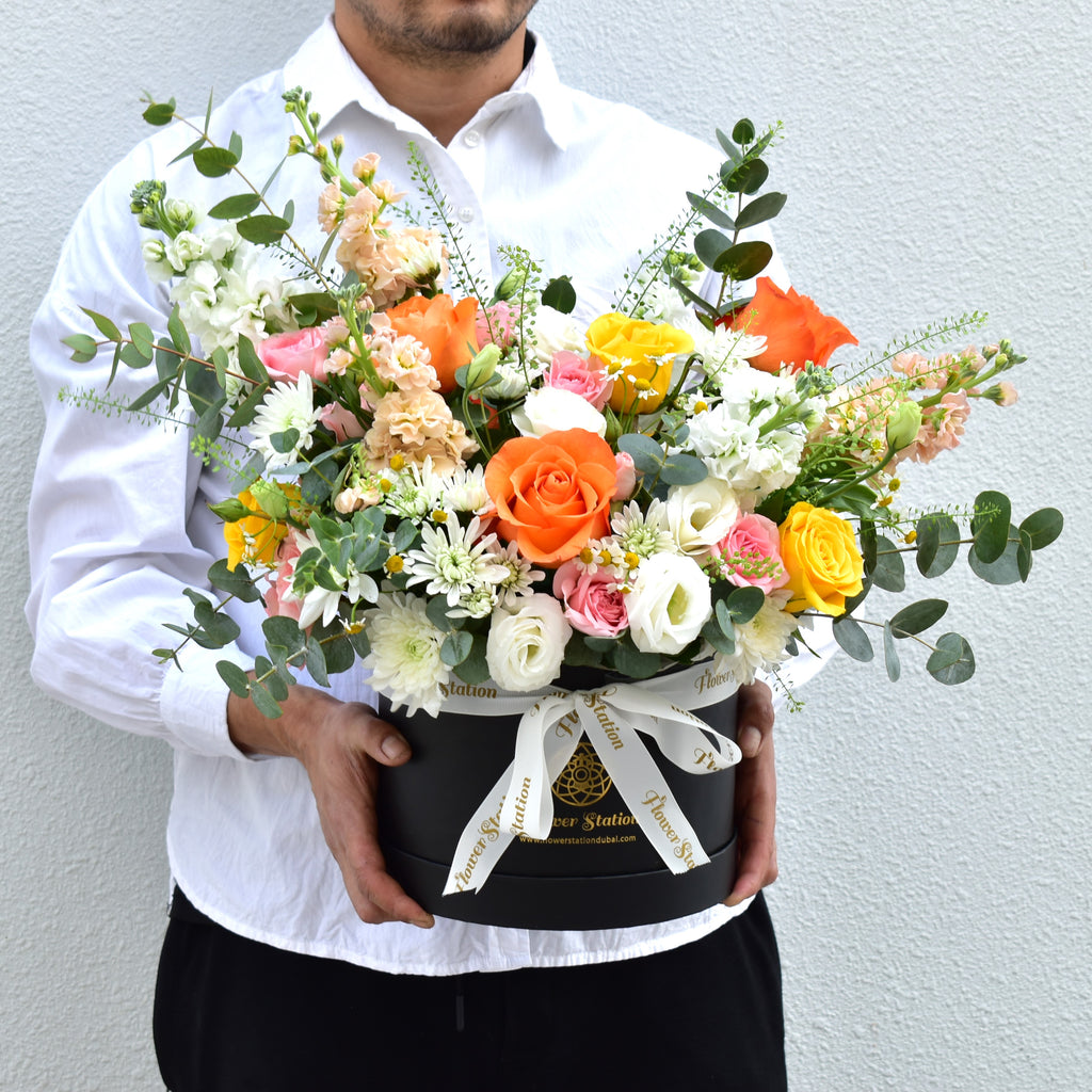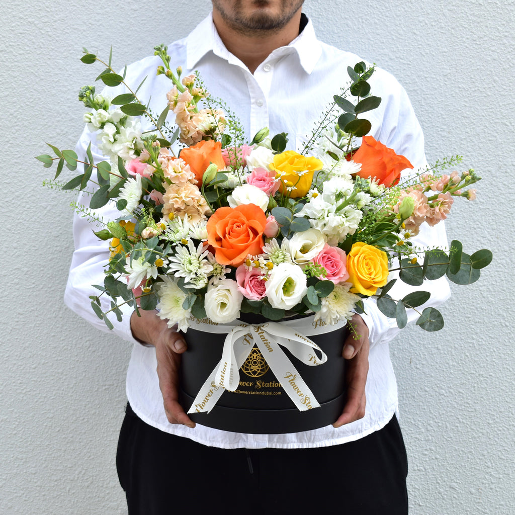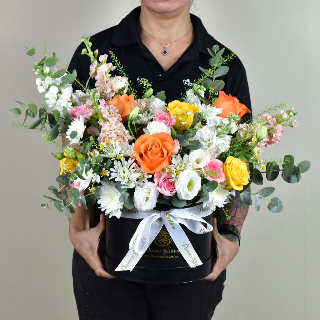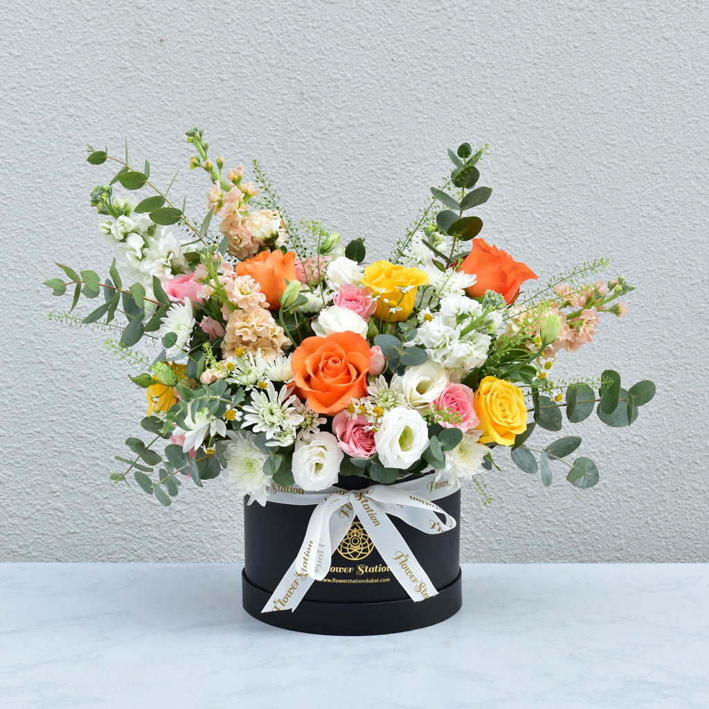 Delicate, balanced, and full of charm  "Sweet Harmony" is a floral arrangement that celebrates beauty in every shade. This handcrafted hatbox features a graceful mix of roses, matthiola, eustoma, chrysanthemums, spray roses, and eucalyptus, arranged in perfect balance to create a refreshing and elegant look.